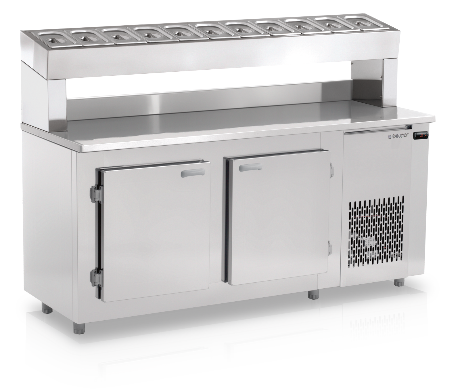 - Refrigeração: No balcão frigorífico: Ar forçado com serpentina aletada / No compartimento superior para cubas: Evaporador tipo serpentina em Tubo de Cobre