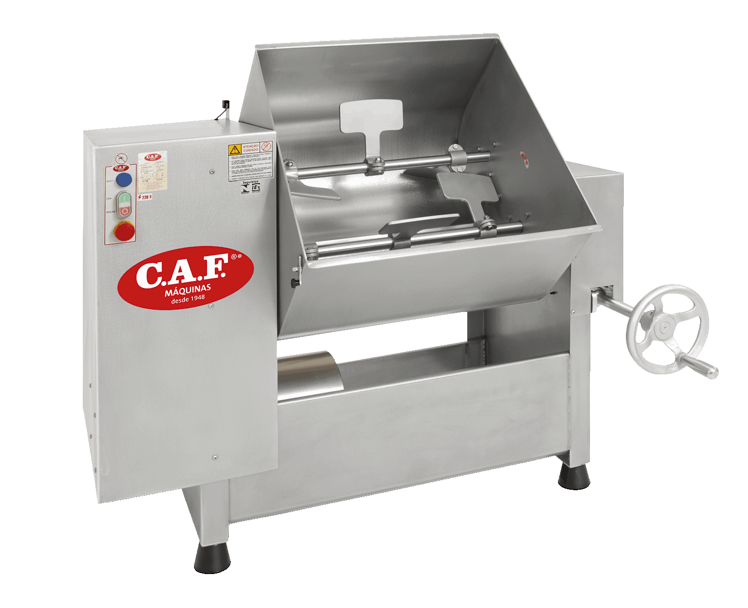 A misturadeira de carne M-180 é um equipamento indicado para uso em pequenas e médias indústrias de embutidos. Estrutura construída em aço inox, caçamba, eixos, pás, tampa e protetores construídos em aço inox. Trabalha com dois eixos, conectados a seis pás, cujo movimento composto proporciona uma mesclagem perfeita. A Misturadeira de carne M-180 é dotada de sistema basculante que permite esvaziar a caçamba de forma simples e prática. Equipada com tampa protetora na caçamba.